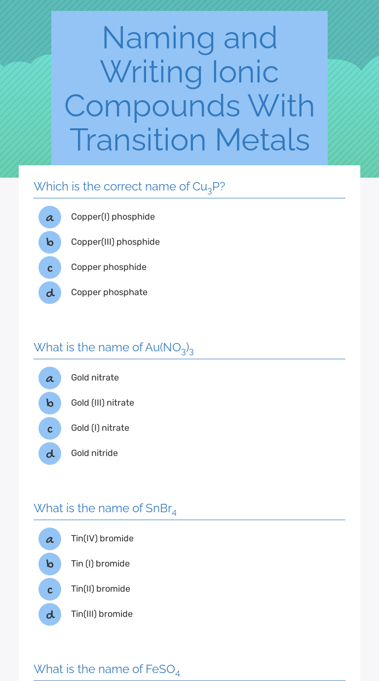 Worksheet 5.1 writing and naming ionic compounds with polyatomic ions and transition. Ionic compounds with transition metals. Ionic compounds containing transition metals. This is a digital worksheet that deals with naming and constructing chemical formulas of ionic compounds that include transition metal ions . Ionic compounds with transition metals.